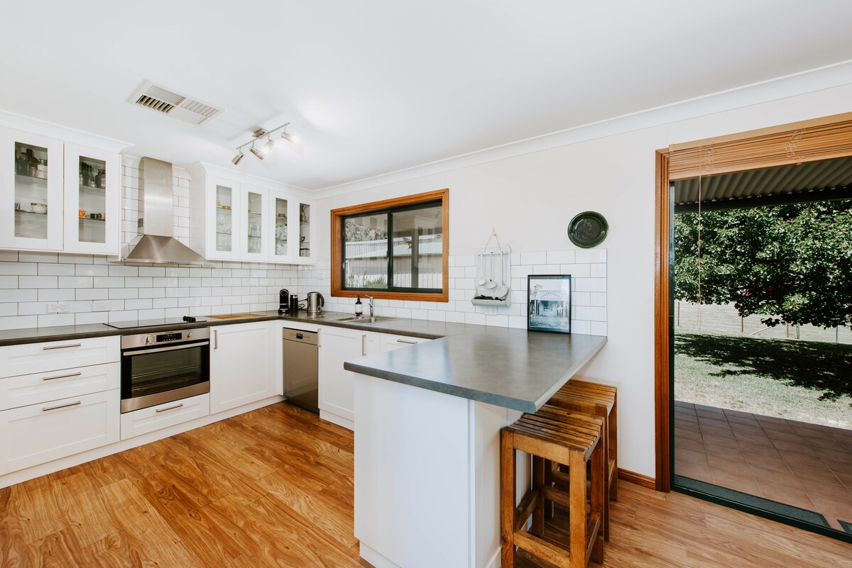 Eurunderee House «you-run-d-ree» es una preciosa casa llena de luz con vistas a los viñedos a solo 5 minutos en coche del centro de Mudgee, enclavada entre famosas bodegas. Perfecta para retiros de fin de semana, catas de vinos, vacaciones, escapadas entre semana, celebraciones y bodas. Cuenta con interiores espaciosos con habitaciones llenas de luz rodeadas de amplios jardines. Disfruta de aire acondicionado por conductos, sala de juegos, piscina, horno de pizza, cancha de tenis o un ciclo rápido a famosas bodegas, restaurantes con sombrero y puertas de bodega.