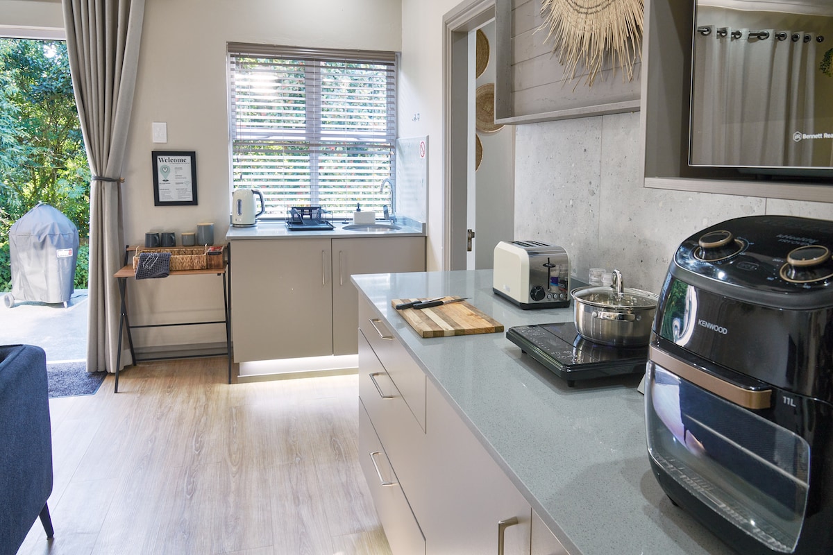 Next to Makaranga (currently closed), the unit has 2 bedrooms with a shared bathroom. The kitchen area has a table & chairs, fridge/freezer, kettle, toaster, induction cooker, air fryer & microwave. Stocked with tea, coffee & sugar. Each of the rooms have a king size bed which can be split into 2 singles, so can sleep 4 people. One of the bedrooms has an aircon & the other a fan and heater. Deck has a bistro table & chairs as well as a daybed for relaxing. Off street parking for 1 car.