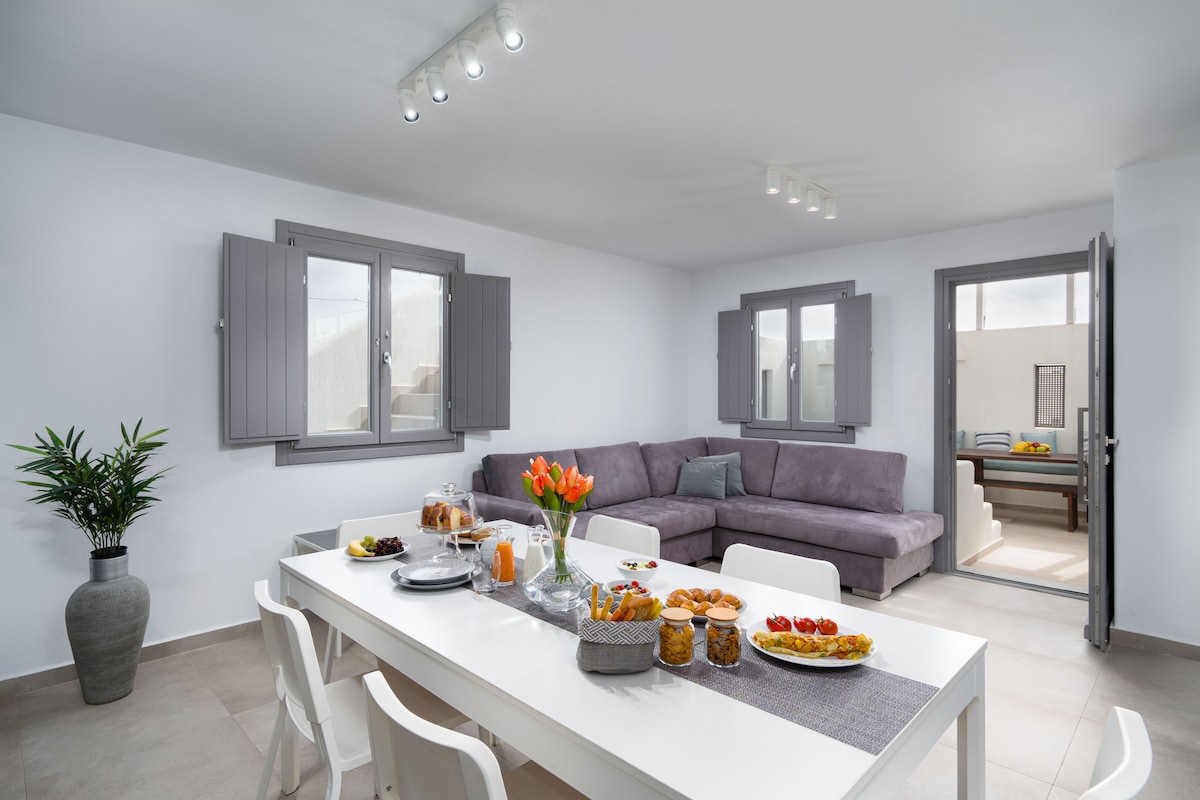 Anemos suite is located in Akrotiri overlooking the caldera and the volcanic islands . It is a suite with Private, Infinity heated Cave style plunge pool with Jet system and private patio. There is a king size bed that can accommodate two person. Daily breakfast is included and served in your suite . There is a cleaning service included. Inform us about your arrival details in advance , we can arrange a taxi/transfer for you.