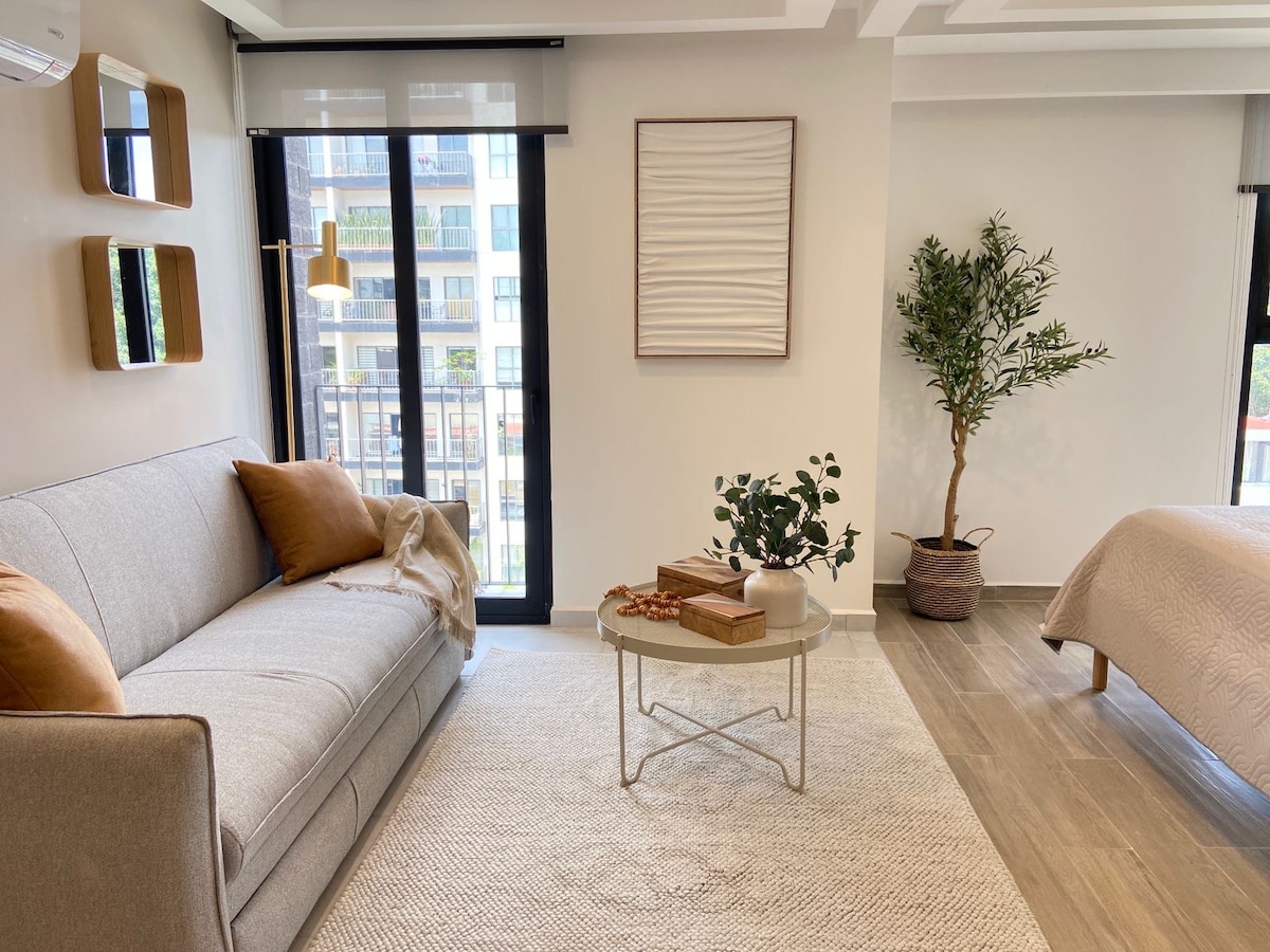 - Acogedor y exclusivo estudio ejecutivo con cama queen-size, escritorio y aire acondicionado. - Balcón para tomar aire fresco. - Cocina equipada. - Ingreso con cerradura inteligente y clave personalizada y exclusiva para cada huésped. - Rooftop panorámico con restaurante en el nivel 9. - Sala de juntas equipada para reuniones profesionales (consultar disponibilidad). - Acceso 24/7 con código personalizado. IMPORTANTE: No contamos con estacionamiento privado dentro de la propiedad.