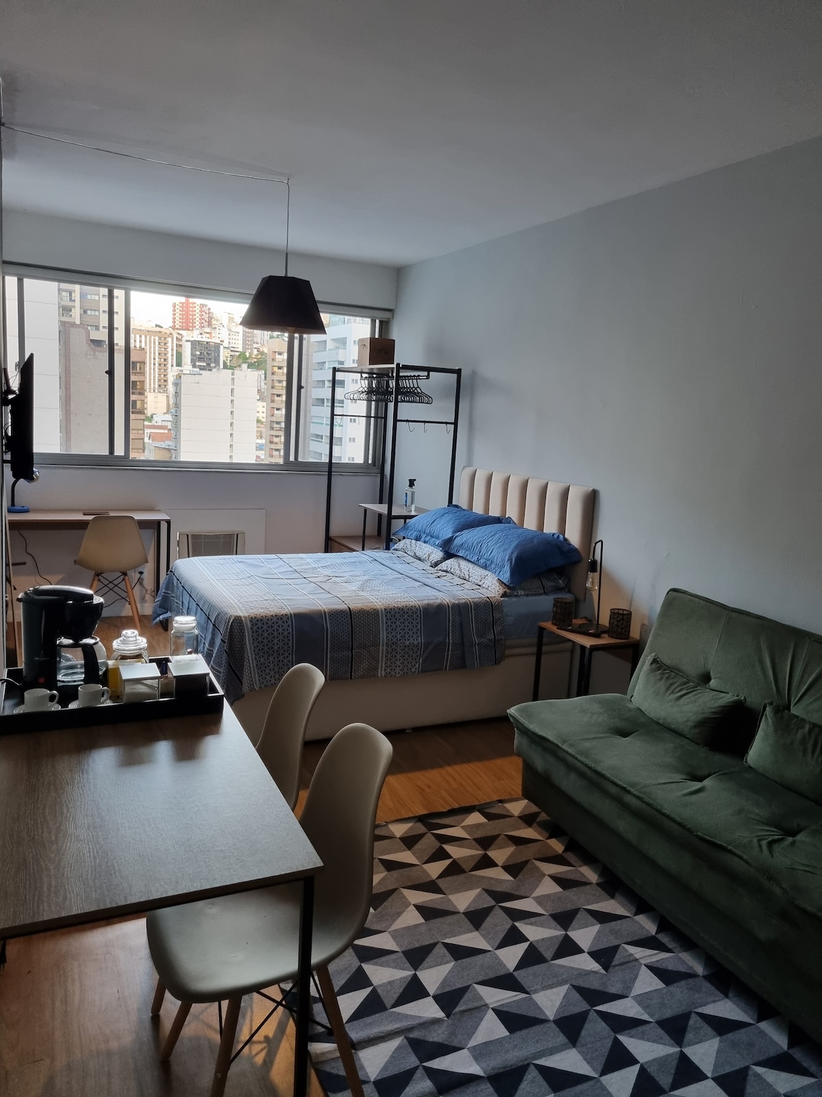 Apartamento tipo estudio súper confortable con una ubicación inmejorable para sus compromisos laborales y/o de ocio. ► Cama doble con colchón de muelles; ► Smart Tv 40” (incluye Netflix, Prime Video, Disney+ y Globoplay); ► Aire acondicionado; ► Ventilador turbo; ► Persiana tipo blackout; ► Armario con perchas; ► Altavoz bluetooth; ► Mesa de estudio/trabajo con lámpara; ► Sofá cama para parejas; ► Mesa de alimentación; ► Cocina equipada para preparar comidas sencillas.