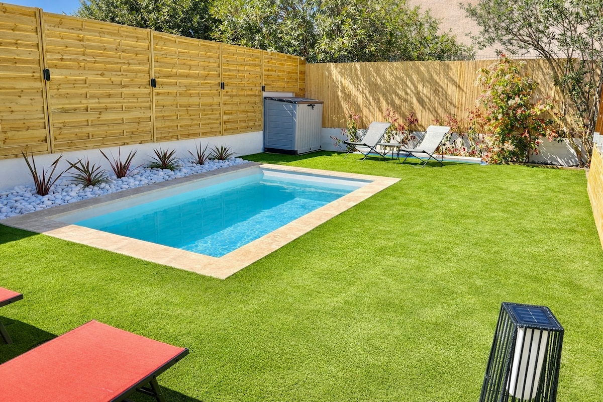 🌿 Séjournez dans une villa lumineuse avec jardin privé, située dans une résidence calme avec piscine. piscine : ouverture du 15 MAI au 15 OCTOBRE HORAIRES : 09h00/21h00 à partir de septembre 10h00/19h00 Profitez d’un intérieur cosy, de trois chambres climatisées, et de deux extérieurs aménagés pour la détente ou les repas. À deux pas du centre-village et à quelques minutes des plages !