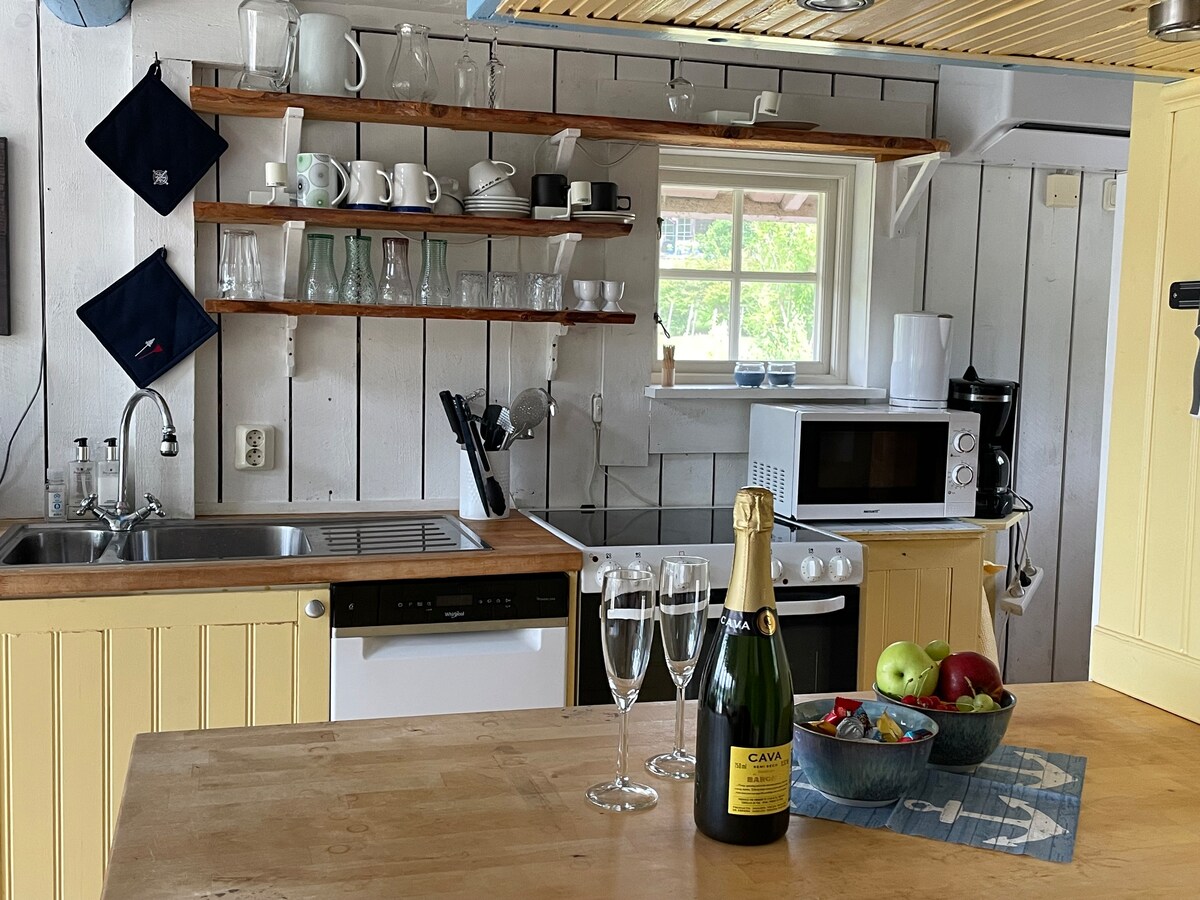Nybyggd stuga på 30 kvm. 5 minuters promenad från hamnen. - Öppen planlösning med kök och vardagsrum i ett. - Sovloft med 2 enkelsängar. - Vardagsrummet har en Bäddsoffa. - Köket har induktionshäll och ugn. - Helkaklat badrum med toalett, dusch och tvättmaskin. - Stor altan runt huset med matplats. - Utsikten består av tall och blåbärsskog - Städning ingår ej. - Husdjur ej tillåtet - Gäster har med sig egna sängkläder och handdukar (kan hyras för 150 kr per person)