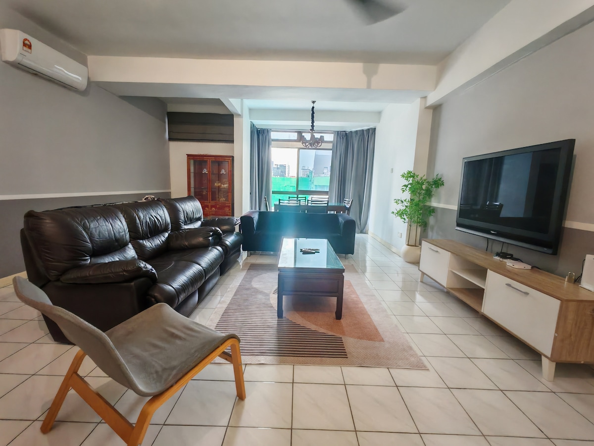 Apartamento moderno de 3 dormitorios y 1800 pies cuadrados recién renovado en el corazón del distrito comercial de KL. Justo enfrente del centro comercial Pavilion. Buena relación calidad-precio y perfecto para familias con presupuesto. Dormitorio principal: 1 cama tamaño king, 1 sofá cama tamaño queen (opcional) con baño privado adjunto. Segundo dormitorio: 1 cama tamaño king, 1 cama individual (opcional) con baño privado adjunto. 3er dormitorio: 1 cama tamaño queen. El tercer baño es un baño común. Los huéspedes podrán acceder a KLCC, B. Bintang y Jalan Alor, todo a 10 minutos a pie. Aparcamiento gratuito disponible.