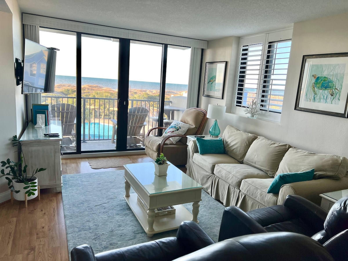 Our oceanfront Atlantic Beach Retreat just had a complete renovation and is perfect for a couple or your family. In the summer months, we do weekly rentals from Sunday-Sunday. During the off season months, we rent this condo for a minimum of two nights. The property includes a large, open field, playground, indoor/outdoor pool, tennis courts, basketball goal, gas & charcoal grills, sauna, hot tub, fitness center, elevators throughout the building, and wheelchair accessible beach access.