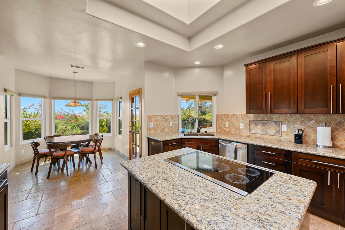 Una hermosa vista de 180 grados te dará la bienvenida a nuestra casa. Ubicada en la cima de una zona residencial, nuestra casa de 2180 pies cuadrados está a pocos minutos del centro de Fallbrook y del Grand Tradition. Contempla las puestas de sol sobre las colinas y disfruta de las luces de la ciudad por la noche desde la terraza elevada o el balcón delantero. Encontrarás todas las comodidades de tu hogar, planta abierta con cocina totalmente equipada, aire acondicionado, televisores inteligentes, wifi mejorado y mucho espacio para familias o grupos grandes.