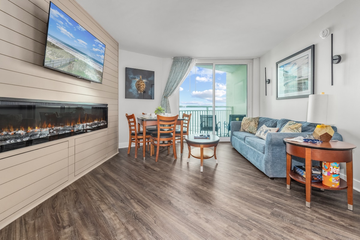 Sofá nuevo Nueva lavadora y secadora Cocina nueva - Baño nuevo. Nueva adición con chimenea y consola de pared de TV. Renovado con todo el piso de madera, muebles y colchones nuevos. Increíble vista del océano Atlántico a través del balcón directo frente al mar, ubicado en el centro de la playa de Myrtle. A pocos pasos del parque de atracciones Family Kingdom, Beach Boardwalk, 2nd Ave Pier. Disfruta de la impresionante vista y la brisa en el balcón. Piscinas climatizadas interiores y exteriores, 3 jacuzzis, gran piscina infantil, río lento.
