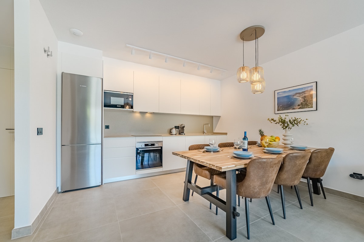 Recently villa in the Habitats Del Duque complex with new furniture and a modern kitchen (wine cooler, plate warmer, oven, microwave, dishwasher, two large refrigerators). It has 5 bedrooms, 4 bathrooms, 2 living rooms, 2 large terraces, and a private backyard over 3 floors. Garage for 2 cars with EV charger. Heated pool (Oct-Apr), washing/drying machines, BBQ, chillout zone, workspaces. A cool beach is a few minutes’ walk away