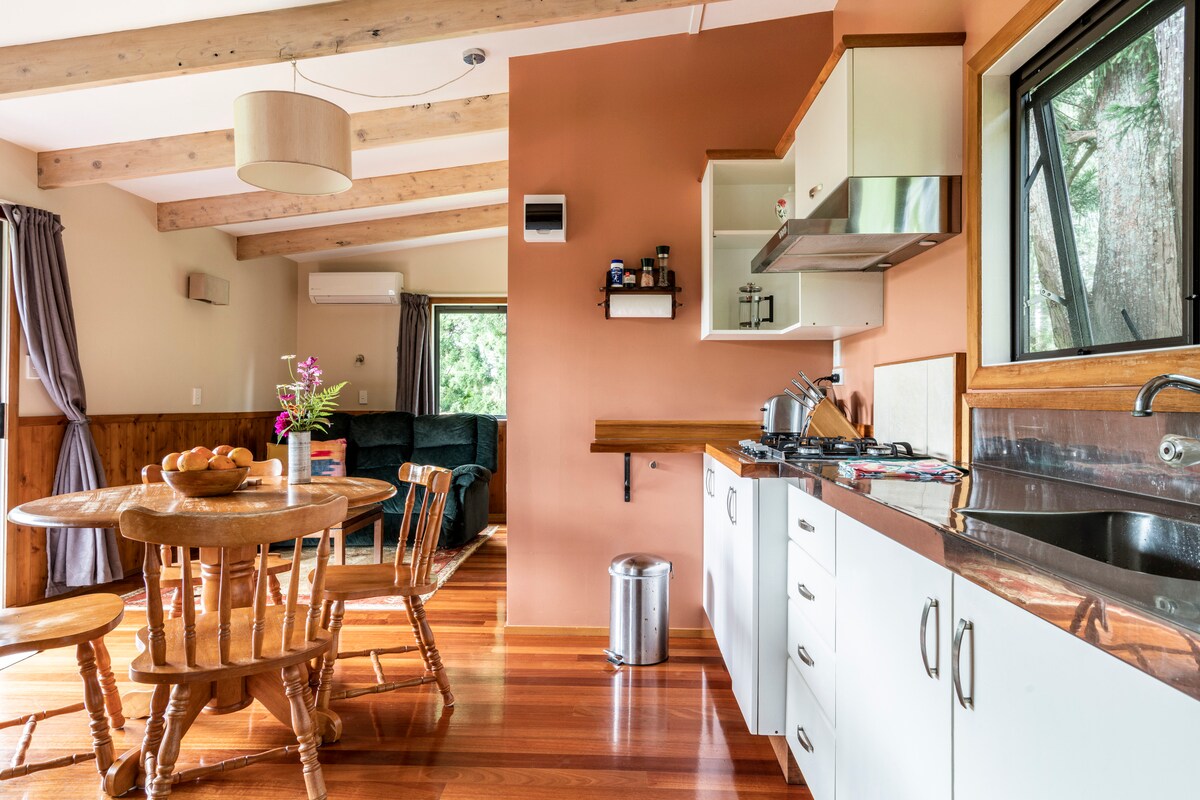 Situado en el país, cerca de Kerikeri, en jardines tipo parque dentro de una pequeña granja de ganado y ovejas. Casa de campo preparada para 2 personas, pero con capacidad para 4 (o 2 personas) utilizando el sofá cama en el salón y el baño a través del dormitorio. Indícanos si es necesario un sofá cama. Dormitorio separado, baño, cocina, cafetera, wifi, TV. Bien ubicado para que los huéspedes experimenten lo mejor de la Bahía de las Islas. Los ingredientes del desayuno continental están disponibles para la preparación de los huéspedes.