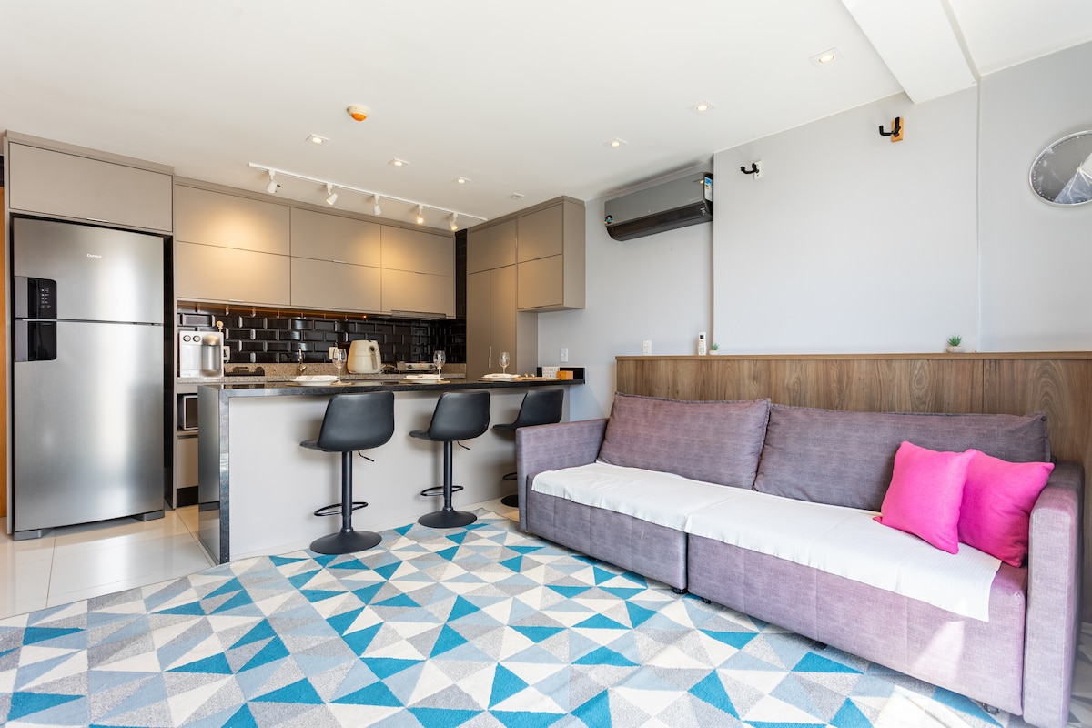 Ideal para quem busca um ambiente moderno, aconchegante e seguro. -AR condicionado ❄️ -Portaria 24h🚨 -Fechadura eletrônica 📱 -1 vaga inclusa🚙 (tag 15,00 adicional) -Wi-Fi com ótima velocidade 🛜 -Há um Mercadinho (muito bom) 🍕 -Ampla disponibilidade de Uber -Cama confortável 🛏️ -Sofá cama casal (confortável pra duas pessoas) Roupa de cama/banho Cozinha bem equipada (Air Fryer, filtro de água, micro-ondas, lava e seca), TV Smart na sala e quarto, lindo banheiro e uma bela varanda.