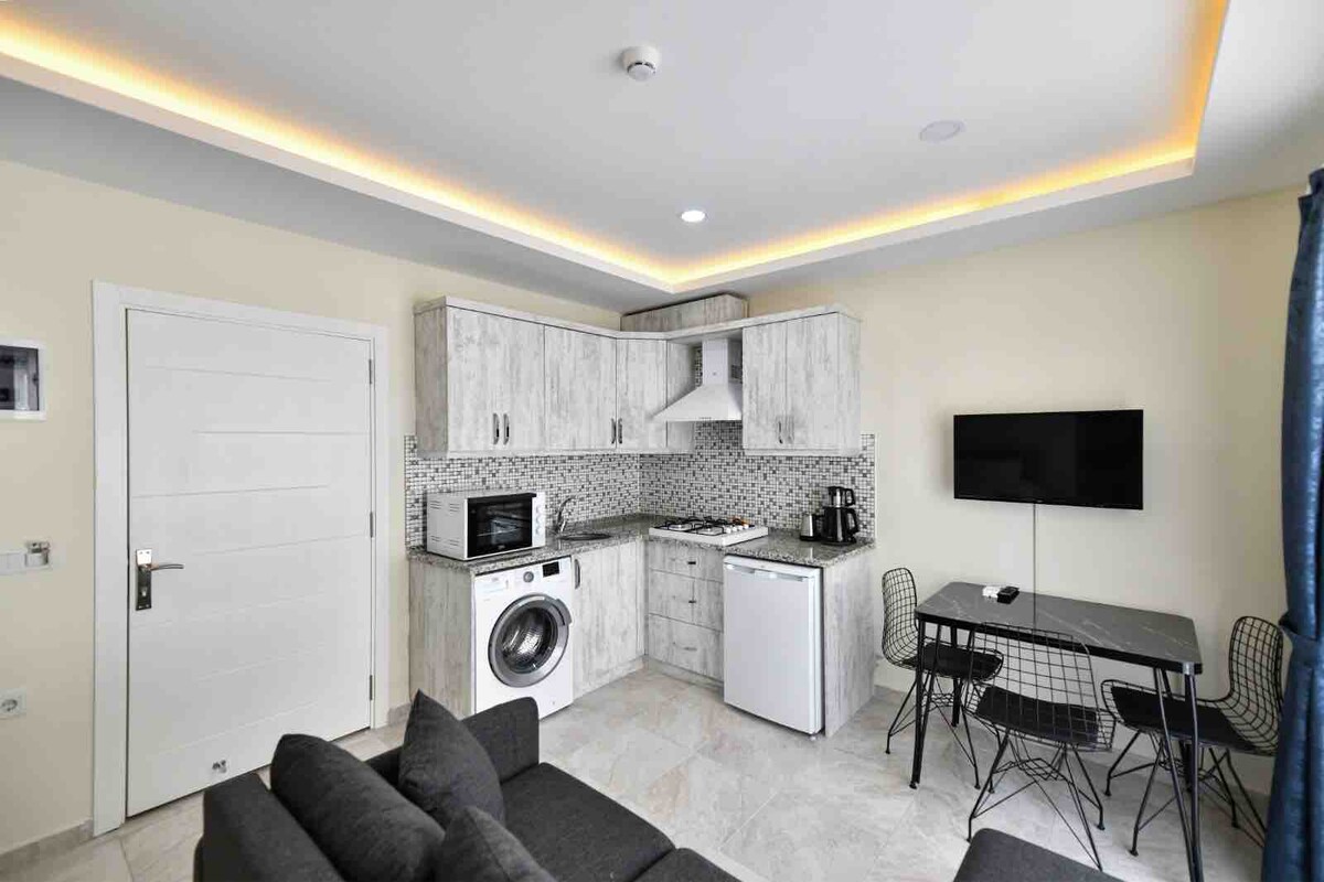 Nuestra suite 1+1, que se encuentra a 3 km de la playa de Ölüdeniz, consta de 1 dormitorio y 1 salón. La piscina es de uso común. Hay utensilios para cocinar aperitivos en la cocina. Está a 500 metros de la calle de bares de Hisarönü, a 50 metros de la parada de autobús, a 50 metros de restaurantes, cafeterías, farmacias y mercados. Nuestra calle es ancha para aparcar. Puede aparcar gratis. Nuestra suite es para 2 personas. Hay 2 balcones.