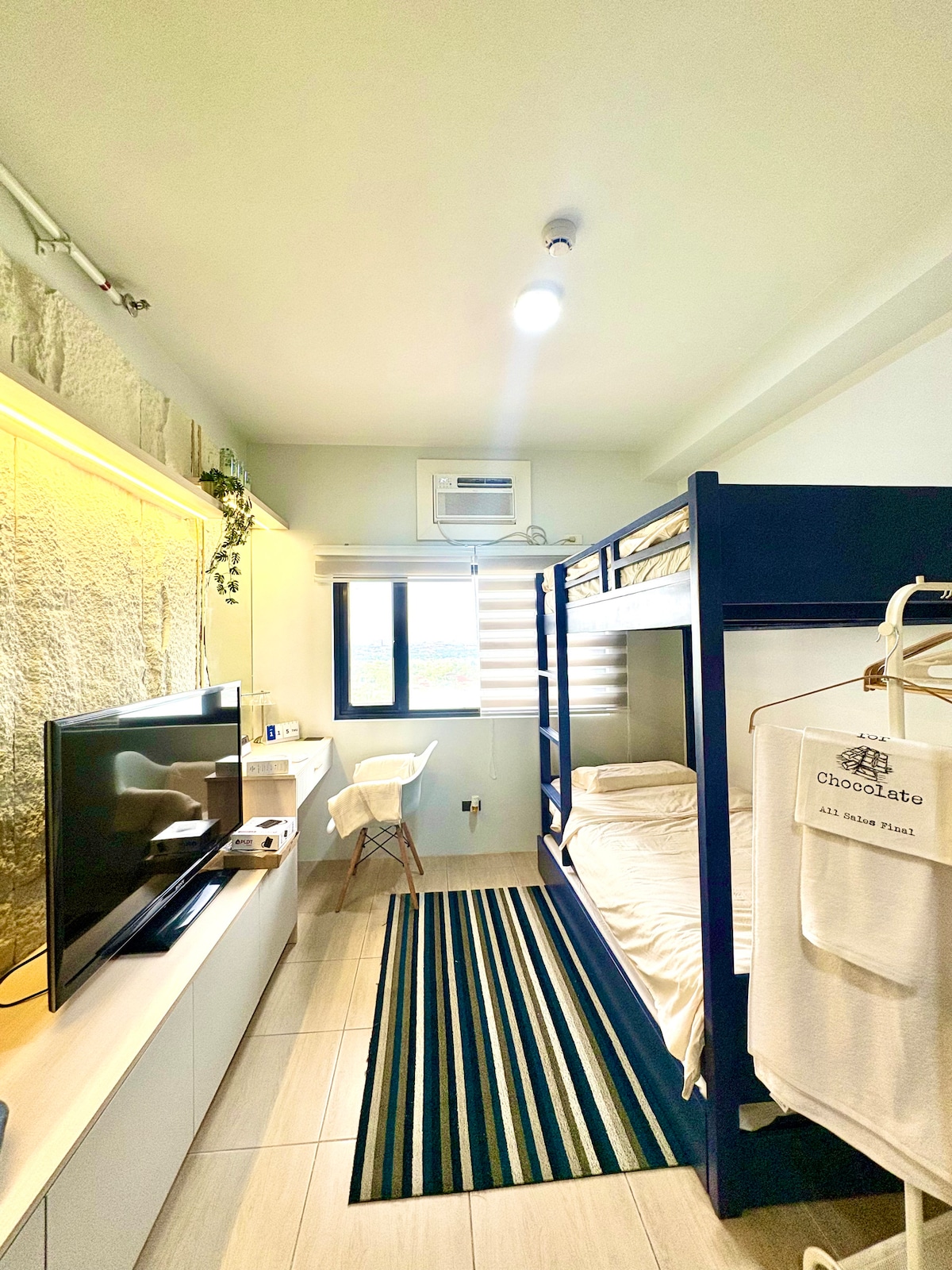 ¡Internet de alta velocidad a 300 Mbps con NETFLIX! ¡Disfruta de una mejor visualización con el televisor SAMSUNG de 43 pulgadas! Baño totalmente renovado y suelo de baldosas en una ubicación DECENTE y MUY SEGURA. Junto al apartamento hay restaurantes y zonas de aparcamiento de pago, ¡y la mayoría de ellos están abiertos las 24 horas del día, los 7 días de la semana! Cerca del aeropuerto a través de Skyway. Con CAJA DE LLAVES para un registro de entrada y salida AUTÓNOMO y sin complicaciones. Dirección completa: Unit 817 Studio Two Building, Crescent Drive, Northgate Cyberzone, Filinvest Corporate City, Alabang, Muntinlupa City