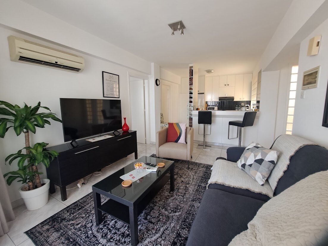 The flat is located in a quiet and well maintained building, in a no through beautiful road, 5-10min walk from Finikoudes promenade and beach. Large living room with a sofa bed, kitchen, a bedroom, bathroom renovated in Nov 24, balcony with distant sea view. The center and the main bus terminal is a 5 min walk, so if you don't rent a car, you will still be in the middle of everything. 200/30 Mbps internet. Zorbas bakery & ready meals is across the street. To see more flats, go to our profile