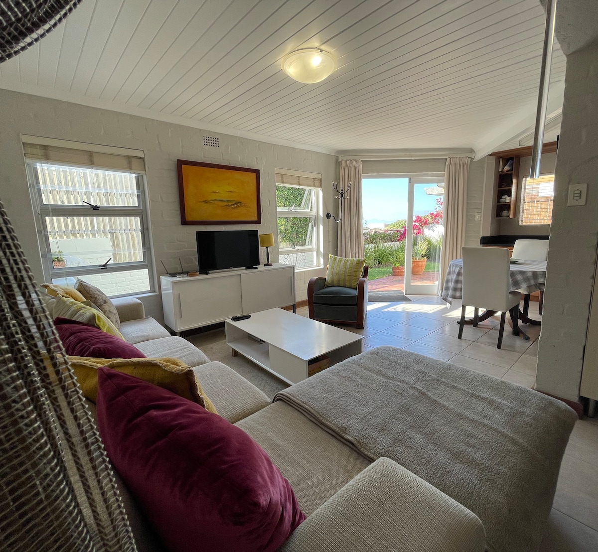 En la ladera de la montaña con vistas a Fish Hoek Beach, este apartamento se abre directamente a un jardín indígena y es ideal para parejas o familias pequeñas. Decorado de forma brillante, el apartamento cuenta con obras de arte originales, un gran balcón con hamaca, barbacoa y vistas al mar y las montañas. Tenemos un sistema de paneles solares con almacenamiento de respaldo para eludir el desprendimiento de carga. Se incluye estacionamiento gratuito en la cochera, wifi y DSTV Compact, y se proporciona un servicio de lavandería a precios razonables.