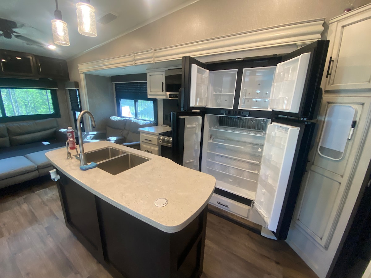 Puerta de entrada al Parque Nacional Glacier; solo 10 millas al este en la autopista 2. Muy cómodo 2019, quinta rueda, aire acondicionado y calefacción. Un dormitorio, cama tamaño king, sofá que se abre a una cama tamaño queen. Chimenea, TV de pantalla plana y WiFi disponible. Cocina y cocina disponibles. Patio privado, fogata, espacio para tiendas de campaña disponible (tu tienda de campaña y tu ropa de cama), vecindario tranquilo. Estamos ubicados justo al lado de la autopista 2, por lo que hay algo de ruido en la carretera. Disfrute de una experiencia de campamento cómoda en la hermosa, al noroeste de Montana.