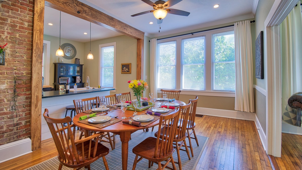Elegante casa de 1926, restaurada con mucho cariño. Encantadora con techos de 12 pies, chimenea de gas, cocina completa y cómodas zonas de comedor y sala de estar. A poca distancia a pie del centro histórico de Hendersonville, con sus excelentes tiendas y restaurantes únicos, incluidos varios pubs cerveceros a poca distancia a pie. Céntrica para algunas de las mejores áreas recreativas y caminatas por cascadas en WNC: Pisgah, Dupont y Green River. Fácil acceso en coche a Biltmore House, el WNC Arboretum, parques para bicicletas e innumerables atracciones de Asheville.