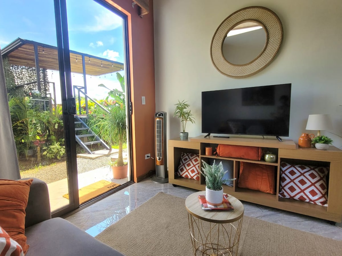 Hermoso estudio a solo un par de cuadras del centro de La Fortuna, ofreciendo versatilidad de explorar el pueblo y la zona turística. Esta completamente equipado, con wifi de alta velocidad (+200 Mbps), una cómoda cama king size, aire acondicionado, Smart TV, cocineta y deshumidificador. Cuenta con una terraza privada con mesa, sillas y jacuzzi, baño privado completo con agua caliente y secador de pelo, caja de seguridad con capacidad para una computadora, armario y estacionamiento.