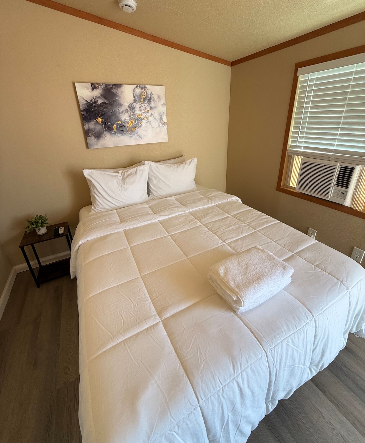This sits on an acre property with another 5 room unit. The people on the property are mostly workers from out of town who need a quick stop, a week to find an apartment, or month to month stays. The bed size is Queen. The door has a code lock to checkin at your convenience. Part of the road is unpaved and shown in a picture. Please take this fact into consideration before booking. I cannot pave the road as it does not belong to me.