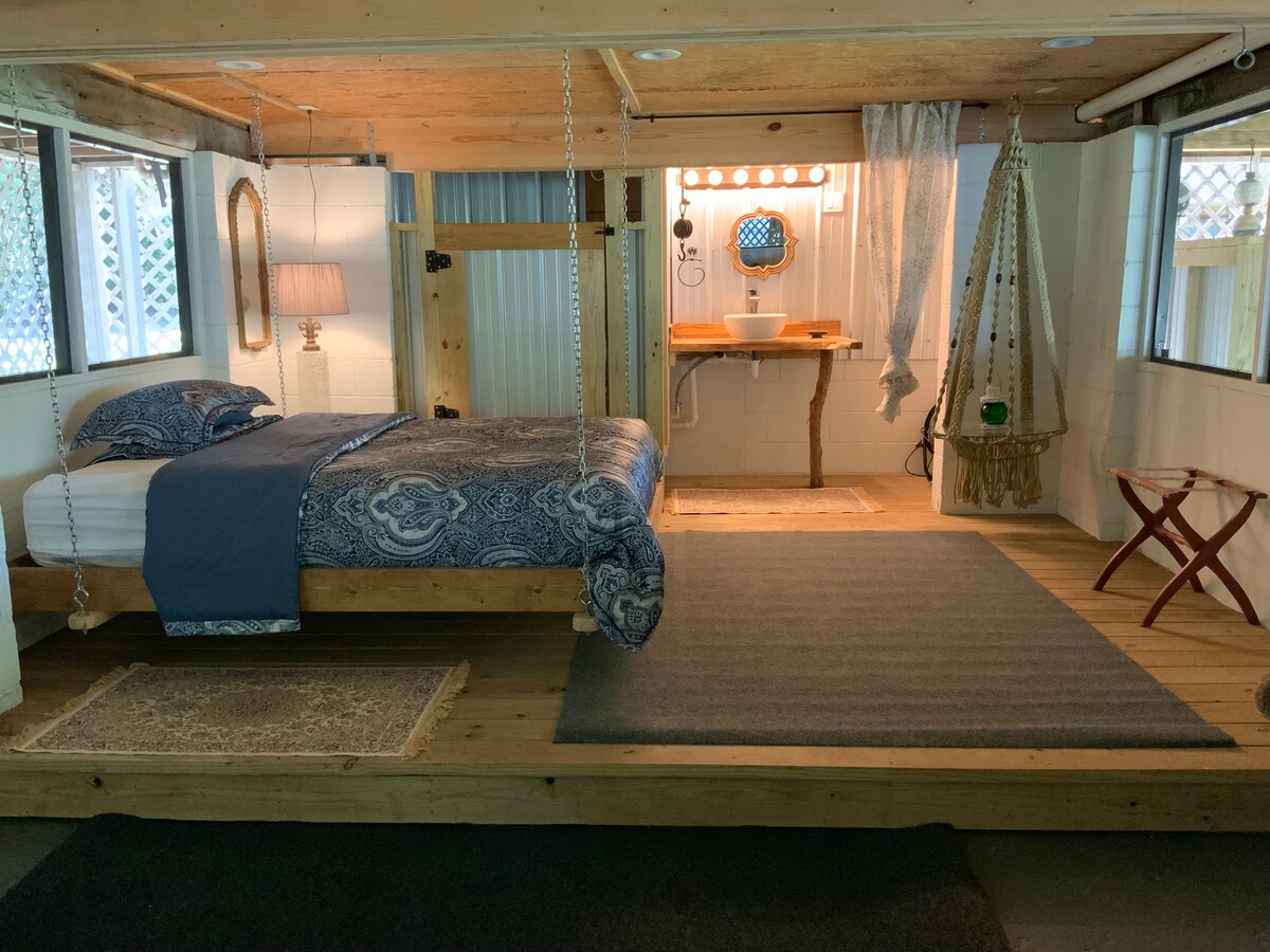 Pasa todo el tiempo que quieras en casa, en la naturaleza, relajándote o recreándote. Esta casa árbol única se encuentra en lo alto de los árboles y en 13 acres de hábitat natural a orillas del río Santa Fe. El Santa Fe tiene mucha vida silvestre, y estamos cerca del famoso río cristalino Ichetucknee y millas de senderos públicos. Compartimos nuestros kayaks, una canoa y muchas comodidades para tu estancia. Así que ve a remar en solitario, únete a los viajes de guías locales a varios manantiales o haz senderismo en la propiedad y en los parques cercanos.