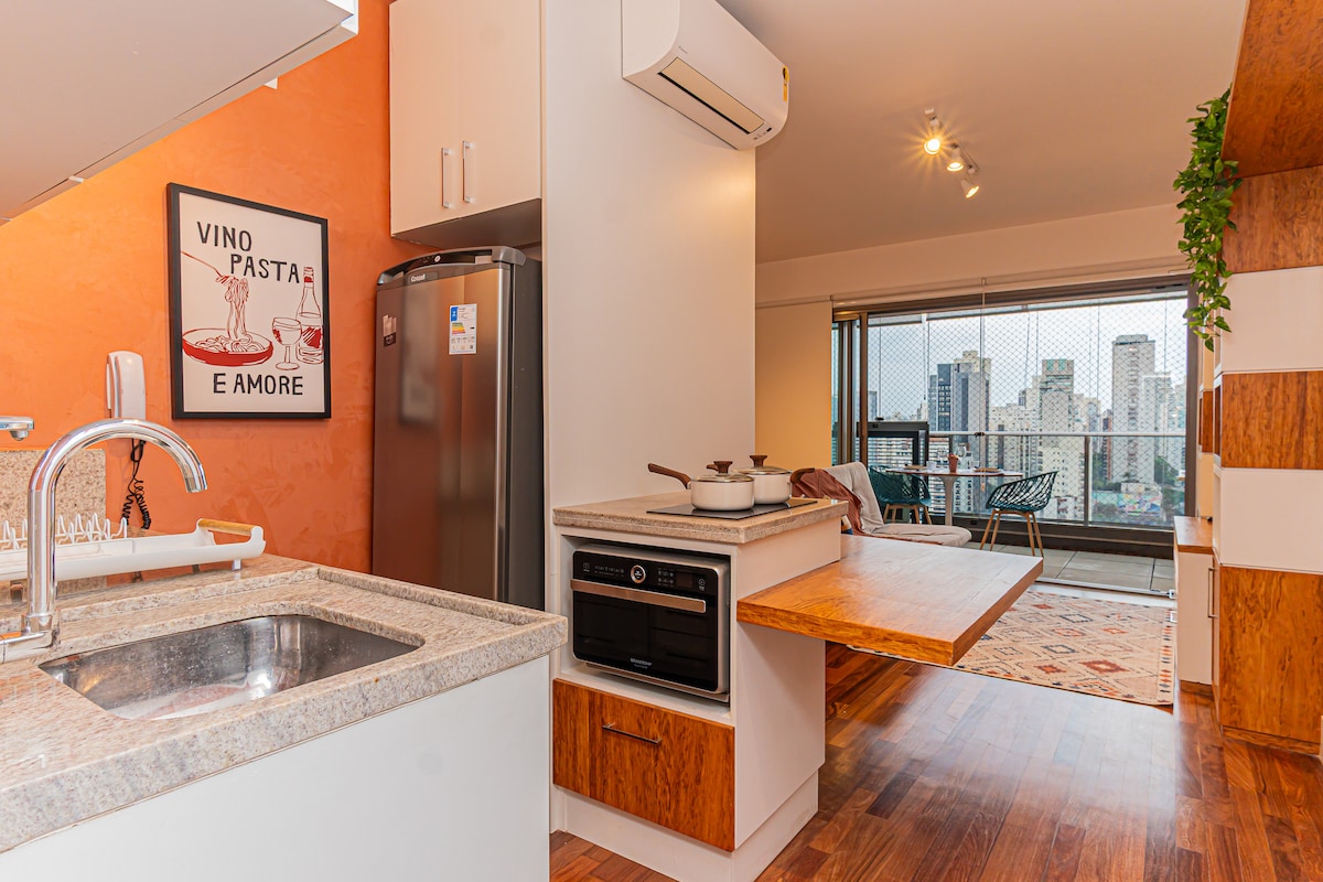 Estudio moderno y muy acogedor, a solo 50 m de la estación de metro Oscar Freire, higienizado después de cada reserva. Acomoda cómodamente hasta 2 personas. Cuenta con espacio de trabajo y comedor, Smart TV con acceso a streaming, Wi-Fi ilimitado y cocina compacta totalmente equipada con refrigerador, hornalla y microondas. El edificio ofrece: Piscina Gimnasio Lavandería Espacio de co-working Mini mercado interno Café Supermercado a 190 m En la zona más exclusiva de São Paulo
