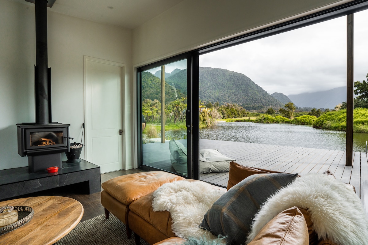 Luxury off-grid cabin in absolute wilderness nestled on the edge of a small lake fed by a pristine mountain stream a 3-minute drive from Franz Josef Glacier village. Sensational views of snow-capped mountains, the lake, glacier, Fritz Falls & rainforest. Super King bed, sunsets, outdoor stone bath, cedar barrel sauna with panoramic window & nature's swimming pool on your doorstep. Experience luxury amidst nature.