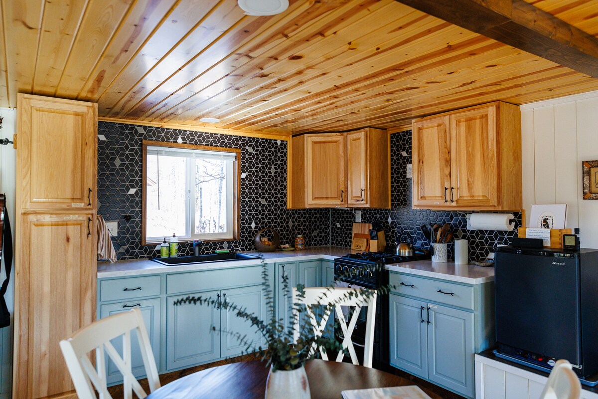 Este escondite sin conexión a la red, alimentado por energía solar, se encuentra en el río Knife, a pocos kilómetros de Two Harbors, Minnesota. La cabaña en sí está llena de comodidades. Una cocina completa, nevera de propano, luces que funcionan con energía solar y una chimenea/caldera de gas ofrecen las comodidades del hogar. Hay un baño exterior y leña para el fogón al aire libre. Tendrás que traer tu propia agua para beber, pero te proporcionamos agua para lavarte las manos y los platos en el fregadero. Tenemos café con utensilios, platos y especias.