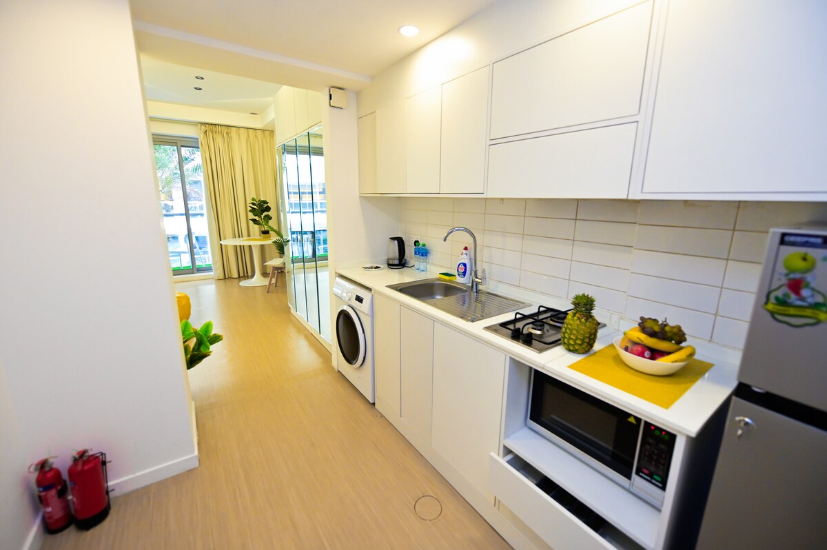 Ubicada en el quinto piso, esta hermosa casa privada de 1 habitación con estilo playero es perfecta para unas vacaciones o para un viaje de negocios. Para mantener el departamento a un precio excelente, se ofrece sin wifi en el alojamiento, y el precio refleja esto. La cocina en forma de U incluye electrodomésticos modernos, ollas, vajilla y cubiertos. La sala de estar cuenta con asientos, opciones de dormitorio adicionales, un televisor inteligente de 58 pulgadas, puertos USB, un escritorio y un balcón con vista lateral al mar.