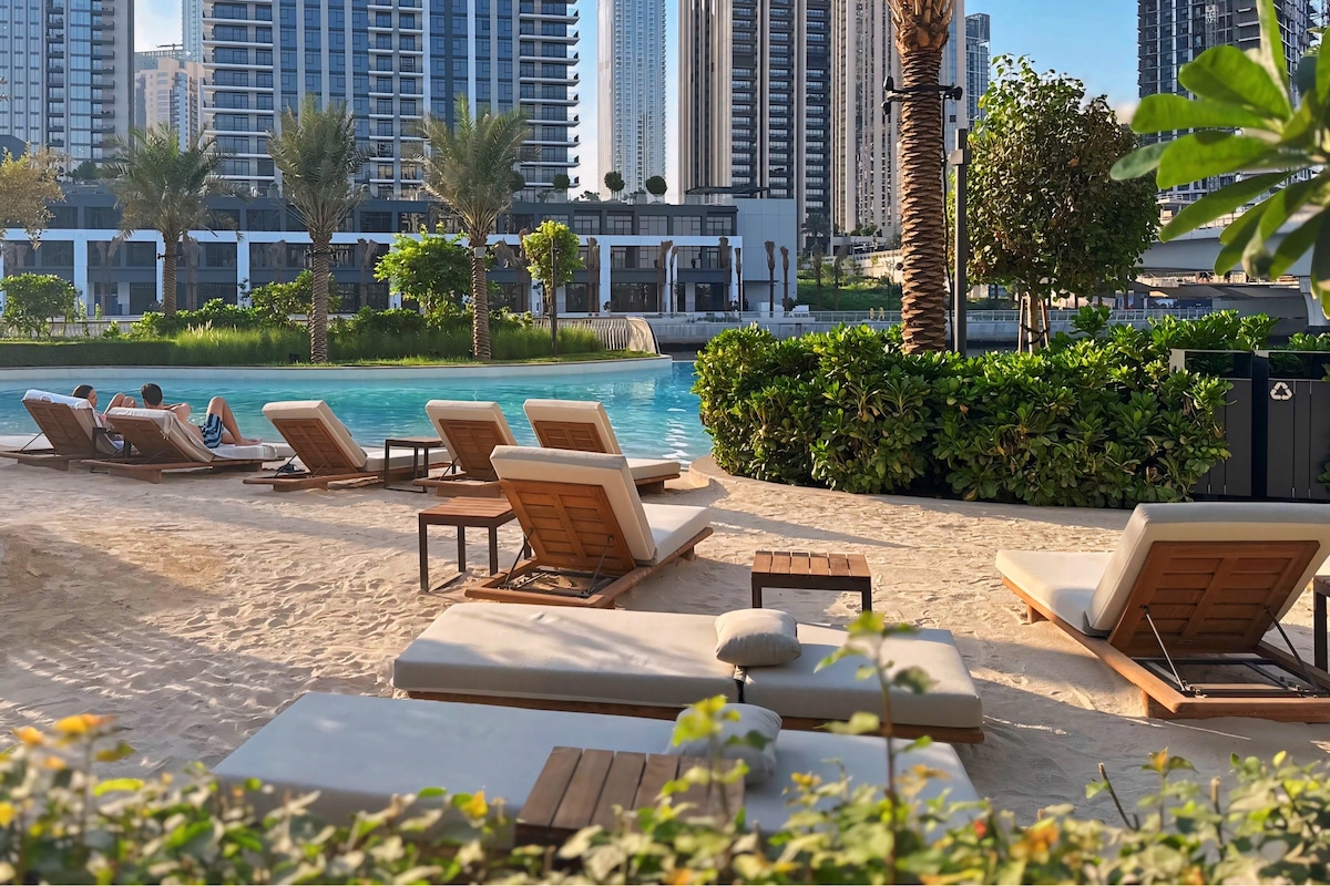¡Llegada autónoma las 24 horas, los 7 días de la semana! ¡Llega en cualquier momento! ¡Anfitriones receptivos, excelente ubicación! ¡Este es tu mejor refugio privado en Dubai Creek Beach! Un apartamento de 1 dormitorio completamente nuevo y bellamente diseñado con sofá cama para 4 personas, está situado a 50 metros de Dubai Creek Lagoon en el corazón de Dubai Creek Harbour, y justo al lado de Vida Dubai Creek Hotel. Perfecta tranquilidad para viajeros de negocios y familias con una playa privada y una laguna. A 20 minutos del centro de Dubai y del aeropuerto de Dubai (DXB).