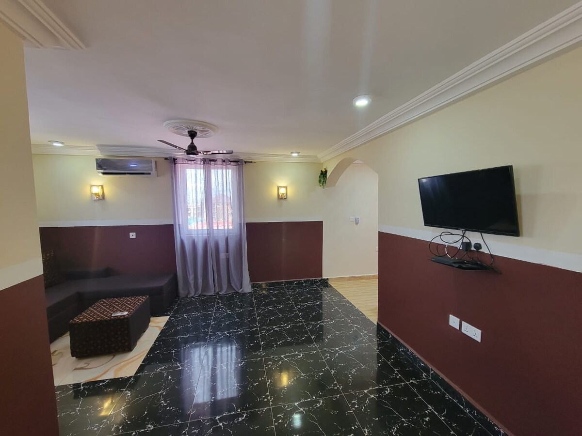 Este espacioso departamento de 2 dormitorios, todos con baño privado, está ubicado en el segundo piso de un edificio seguro y cerrado de tres plantas en Ofankor Barrier, Accra. Cada habitación cuenta con aire acondicionado, televisor inteligente, wifi y duchas con agua caliente. El alojamiento se encuentra en una zona residencial tranquila y segura, a unos 16 km (entre 20 y 30 minutos) del Aeropuerto Internacional de Kotoka y a poca distancia en automóvil del centro comercial Achimota Mall y de Melcom. Los huéspedes disponen de estacionamiento seguro, una zona de descanso en la azotea y un anfitrión en el lugar para garantizar una estancia sin complicaciones. Fácil acceso a taxis, Uber y Bolt.