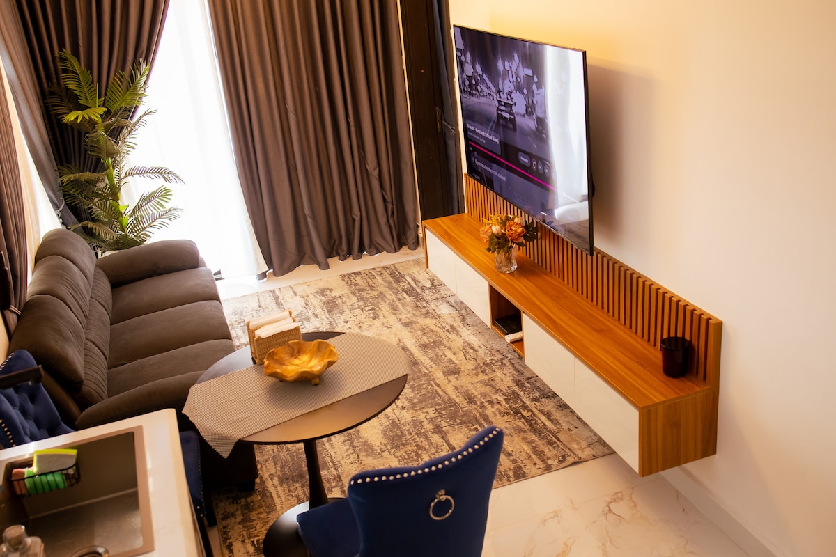 Impresionante estudio moderno diseñado para la comodidad y el estilo. Este espacio elegante y seguro cuenta con una cama tamaño king, vestidor, cocina totalmente equipada, SmartTV de 55", Internet de alta velocidad, aire acondicionado y un generador de reserva. Ideal para viajeros solitarios o parejas. Ubicado en un barrio tranquilo a solo 25 km del aeropuerto de Accra. El servicio de traslado desde y hacia el aeropuerto está disponible bajo petición por una tarifa adicional. Hay estacionamiento seguro disponible. Ten en cuenta que hay una actividad ligera de la iglesia cerca los viernes (de 9:00 a. m. a 11:00 a. m.) y los domingos (de 10:00 a. m. a 1:00 p. m.).