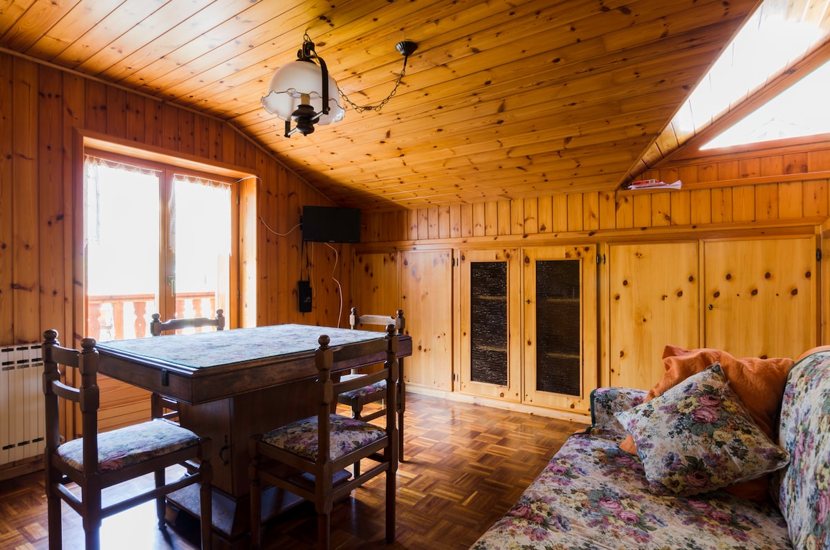 Alps Mountains. Italy. Aosta Valley. A cabin in a small village at 1600 meters,in the peace of meadows, grazing cows and mountains. Snow (usually) in the winter. A place of the heart, lovingly restored preserving the ancient beams of the roof. A wonderful view from the large windows and a special tranquility for those in search of peace, warmth and relaxation. The furniture is very nice: wood above all, but also more lively colors, and modern comforts. Quiet excursions, both on snowshoes or ski.