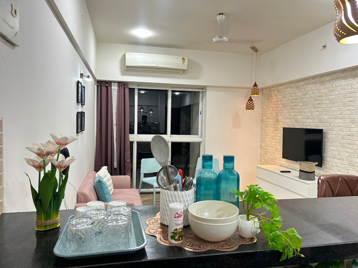 Wifi habilitado - Bien amueblado, espacioso apartamento de 600 pies cuadrados de 1 dormitorio en el piso 19 alrededor de un campo de golf. Este piso da al estadio Grand MCA y a los Ghats occidentales, con vistas desde cada una de las habitaciones. El apartamento está bien equipado y cuenta con todas las comodidades, incluida una cocina bien equipada con necesidades básicas como té/café y especias. El campo de golf de 9 hoyos, par 27, dentro de la propiedad es accesible para los huéspedes de pago y juego. Los no golfistas pueden disfrutar del paseo por el campo y el paseo marítimo.
