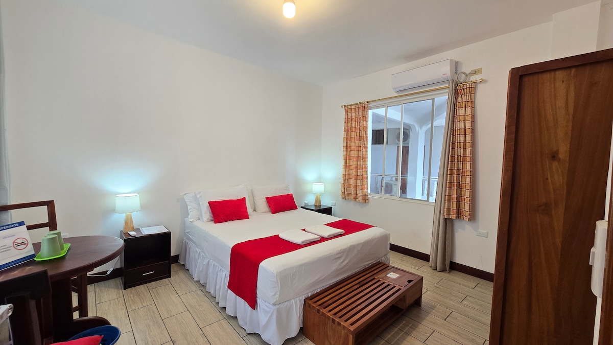 Habitación doble cómoda y funcional ubicada dentro de un hotel en Galápagos, ideal para parejas o dos viajeros que buscan descanso después de un día de playa y recorridos por la isla. El hotel cuenta con piscina, patio y mesas al aire libre para disfrutar un ambiente tranquilo. Se encuentra a pocas cuadras del mar, lo que permite llegar caminando a la playa. Espacio limpio, bien cuidado y con excelente relación precio–calidad.