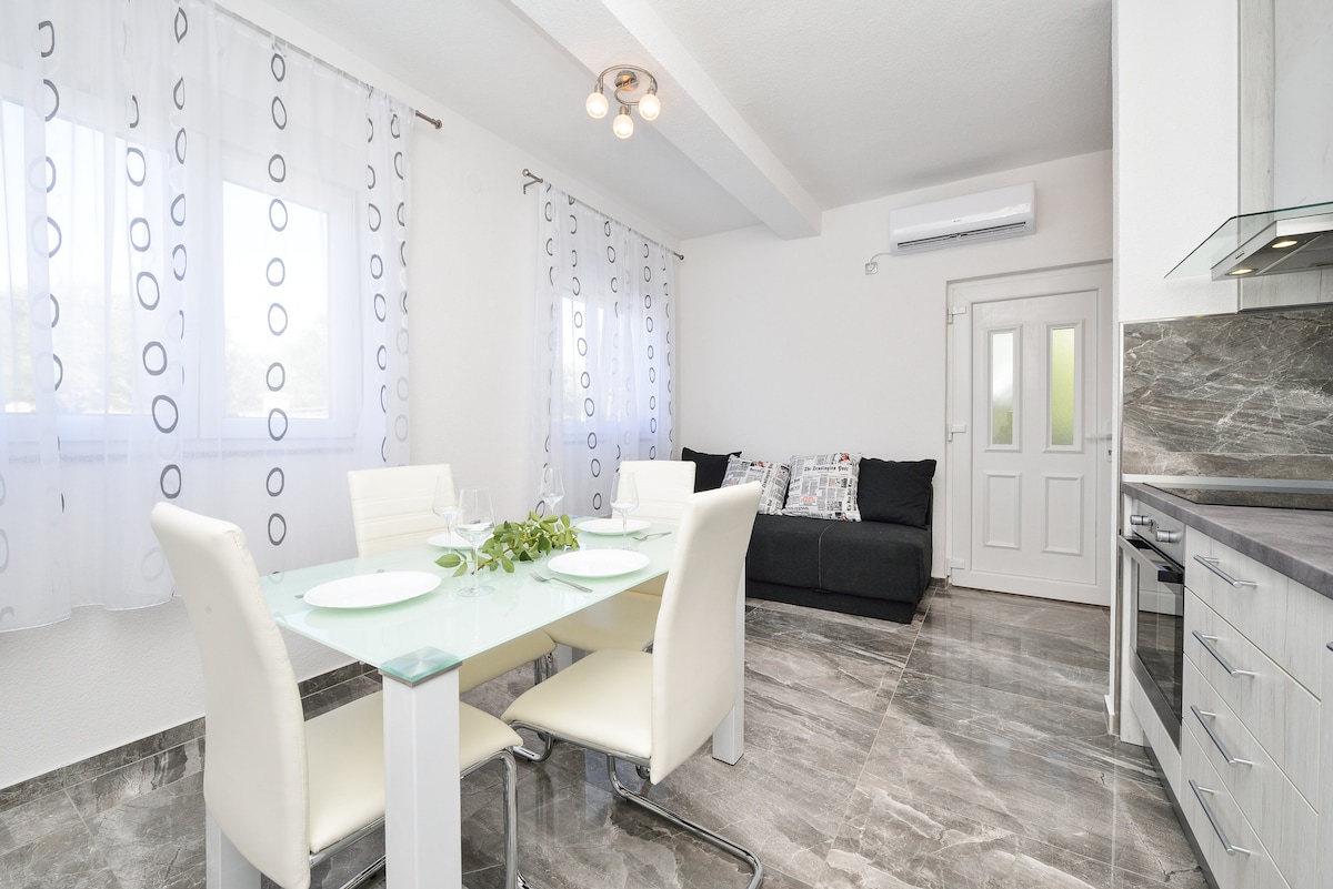 El apartamento está situado en una ubicación ideal. Está a 400 metros del mar. Zadar está a 20 minutos en coche. Está situado cerca del Parque Natural del Lago Vrana. En el apartamento encontrarás un dormitorio con cama doble y armario, y un baño con cabina de ducha. Cocina/sala de estar en una sola pieza con sofá extensible para una persona, nevera, fogones, todos los utensilios para cocinar, mesa, hervidor y aire acondicionado. La capacidad es ideal para 3 personas. También hay aparcamiento privado.