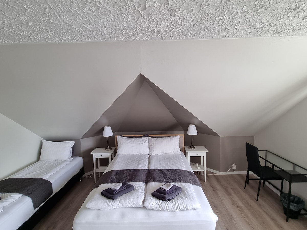 Top floor, centrally located and well connected to bus stops and main roads. The kitchen was completely renovated in 2022. There are windows and views in all directions. In the Big Room, renovated in 2025, there’s a bed of 200x180cm and a long sofa, for a third person. The windows, facing South and West, have “blackout curtains” to keep out the midnight sun. There's books on Iceland and a bluetooth speaker. A closet and a desk. You can borrow a small TV. Icelandic rental permit: HG-4537