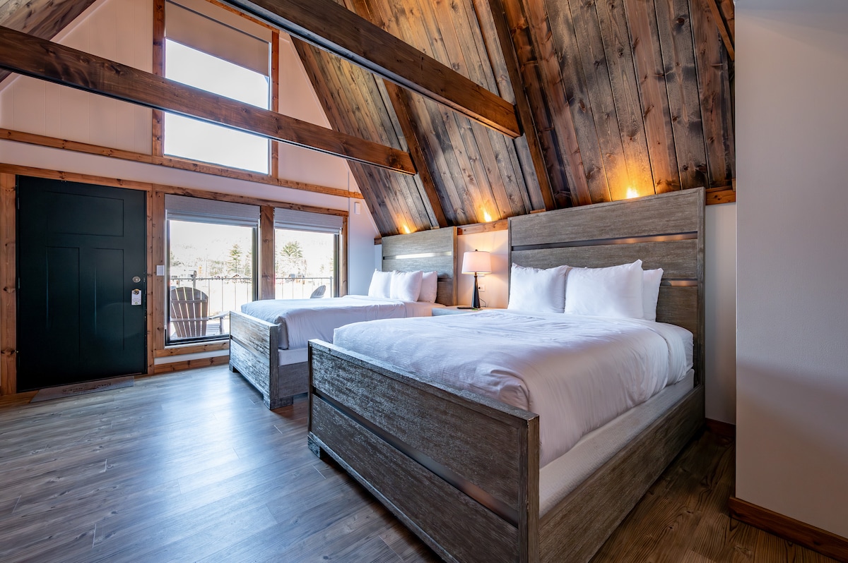 Relájate en esta espaciosa habitación con techo abovedado de estilo cabaña de madera con dos camas tamaño queen y una chimenea eléctrica para que todos la disfruten. Equipado con un lujoso baño con ducha a ras de suelo, productos de baño de calidad, cocina pequeña y TV inteligente. Disfruta del aire fresco de la montaña y de tu café matutino caminando justo por tu puerta hasta la terraza, donde tienes dos sillas que inmediatamente muestran un hermoso amanecer con vista al lago.