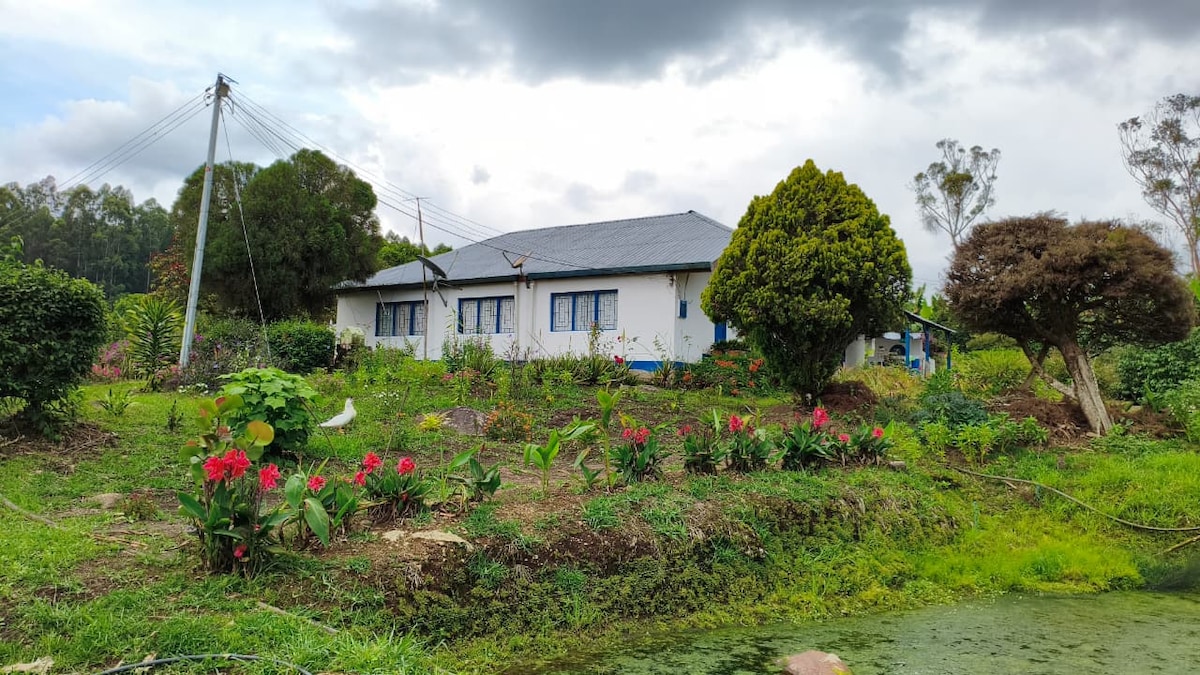 Casa de campo con hermosa vista y clima espectacular, decoración con hamacas, hermosa vegetación, jardines, sillas de descanso, muy iluminada, corredores amplios, columpios para niños, lago con muelle para llegar a un kiosco, barbecue y horno de leña, cocina dotada, una piscina para adultos y una piscina para niños, zona tranquila para descansar, a 10 minutos en carro del pueblo por vía completamente pavimentada.