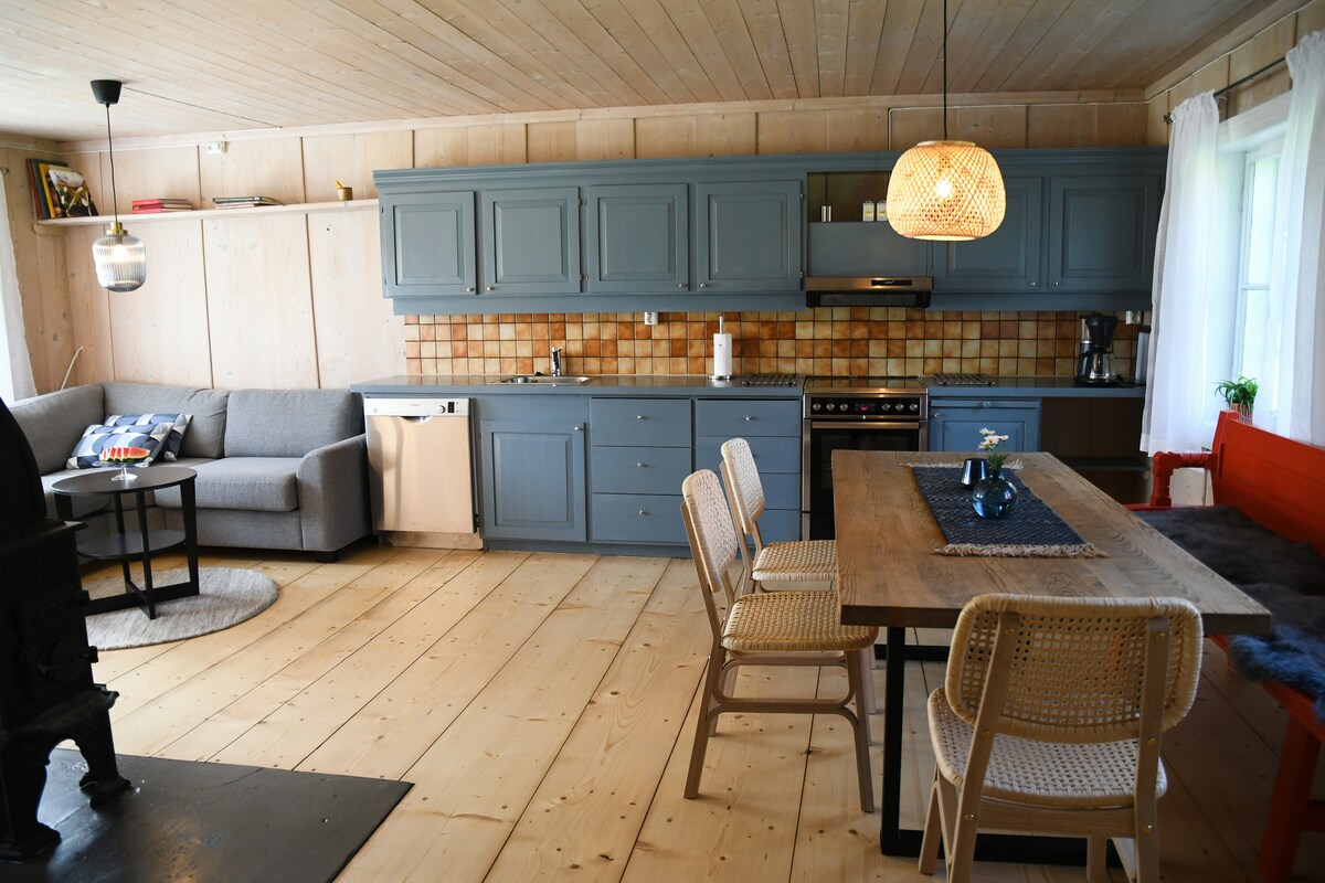 Koselig tømmerstue med unik landlig stil leies bort til overnatting. Varmepumpe og rentbrennende peisovn. Eget oppvarmet bad/dusj/toalett/vaskemaskin/tørkestativ/oppvaskmaskin i kjelleren på tilstøtende kårbygning (20 meter fra hytta). Ikke innlagt vann i selve hytta. Kjøkken/kokemuligheter inne. 2 x 120 senger + gjesteseng. Stoler under tak, utemøbler og bålpanne. Sengeklær og håndklær er inkludert i rengjøringsgebyret. Ved til oppvarming er inkl. Ved til bålpanne selges på forespørsel.