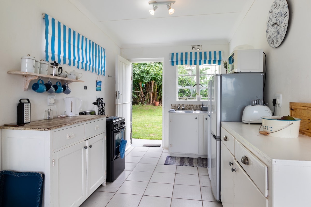 Casa de vacaciones soleada y blanca de dos pisos en el refugio africano seguro de Morganbay. Vistas panorámicas desde la amplia terraza con vistas a la laguna/reserva natural (repleta de aves exóticas africanas). Disfruta de tu bebida al atardecer mientras te reclinas en una silla flotante o hamaca. Cada habitación está decorada con buen gusto con artesanías locales, lino blanco percal y un ventilador de techo. A 6 minutos a pie de la playa prístina apta para perros. Mesa de billar, dardos, DSTV, juegos de mesa, revistas. NOTA: LAS TARIFAS SON POR PERSONA COMPARTIENDO