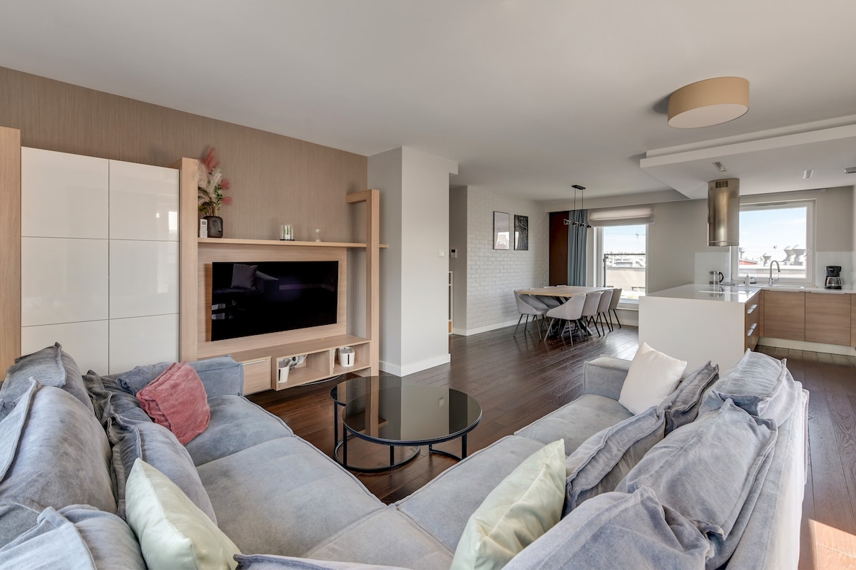 ¿Puedes combinar vistas perfectas de postal, comodidad de alta gama y una dosis adecuada de relajación después de un día completo de exploración de la ciudad? Sí, puedes hacerlo y lo encontrarás todo en el último piso del moderno edificio de Chmielna 63, donde la comodidad no es solo un lujo, sino una necesidad. Este elegante ático es más que un lugar para dormir: es un espacio versátil que puede satisfacer tus necesidades únicas. Además, cuenta con una amplia terraza privada con una vista impresionante del horizonte del casco antiguo de Gdańsk.