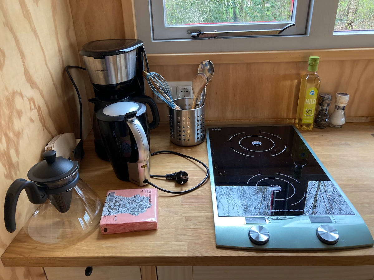 Este vagón / minicasa Pipo tiene; calefacción central (por suelo), aire acondicionado (split), aire acondicionado, lavavajillas, estufa Boretti, cafetera, terraza grande con barbacoa Kamado, muelle de caja ajustable eléctricamente 140 x 210 cm, TV interactiva, Netflix, wifi, ropa de cama y baño y productos Rituals. 1 o 2 bicicletas eléctricas para 15,-/ día 1 o 2 electrobicicletas para 30,- / día descansando en medio de la vegetación entre Herikerberg y Borkeld/Montaña Frisiana. Senderismo / ciclismo; ruta en bicicleta de montaña a 100 metros.