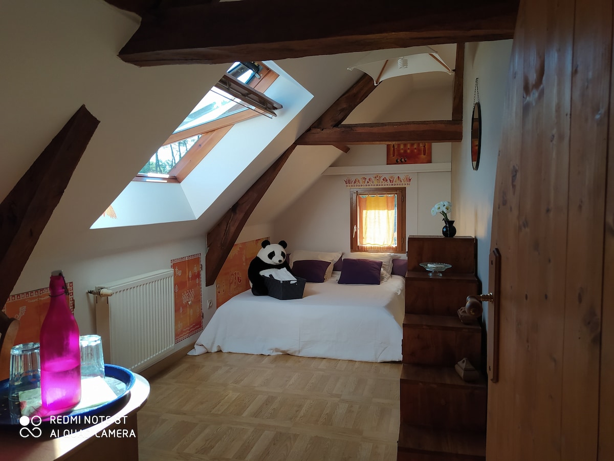 He imaginado para usted en una de nuestras dependencias un lugar único donde se mezclarán la relajación, el placer y el romance. Dé rienda suelta a sus deseos durante una noche o más en total intimidad en esta suite con mesa de masaje y jacuzzi privado. Para hacer su estadía aún más agradable, ofrezco como suplementos, desayuno, tabla de embutidos, queso o raclette, una fórmula de eventos AMOR o BOHEME. ¡No lo dude!
