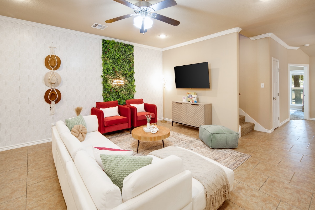 ¡Hola! Bienvenido a Howdy Home en el encantador distrito histórico de Bryan, a solo 10 minutos a pie del centro de Bryan. Perfecto para visitas a Texas A&M (a solo 6 millas de distancia) o Legends Event Center (a 7 minutos de distancia). Disfruta de un registro de entrada y salida sin esfuerzo, una cocina totalmente surtida y un patio trasero privado con fogata y cornhole. Relájate con TV de 65 pulgadas y sonido Sonos. Capacidad para 6 personas: 1 cama tamaño king, 1 cama tamaño queen y 2 camas individuales. ¡Reserva tu escapada relajante a Bryan!