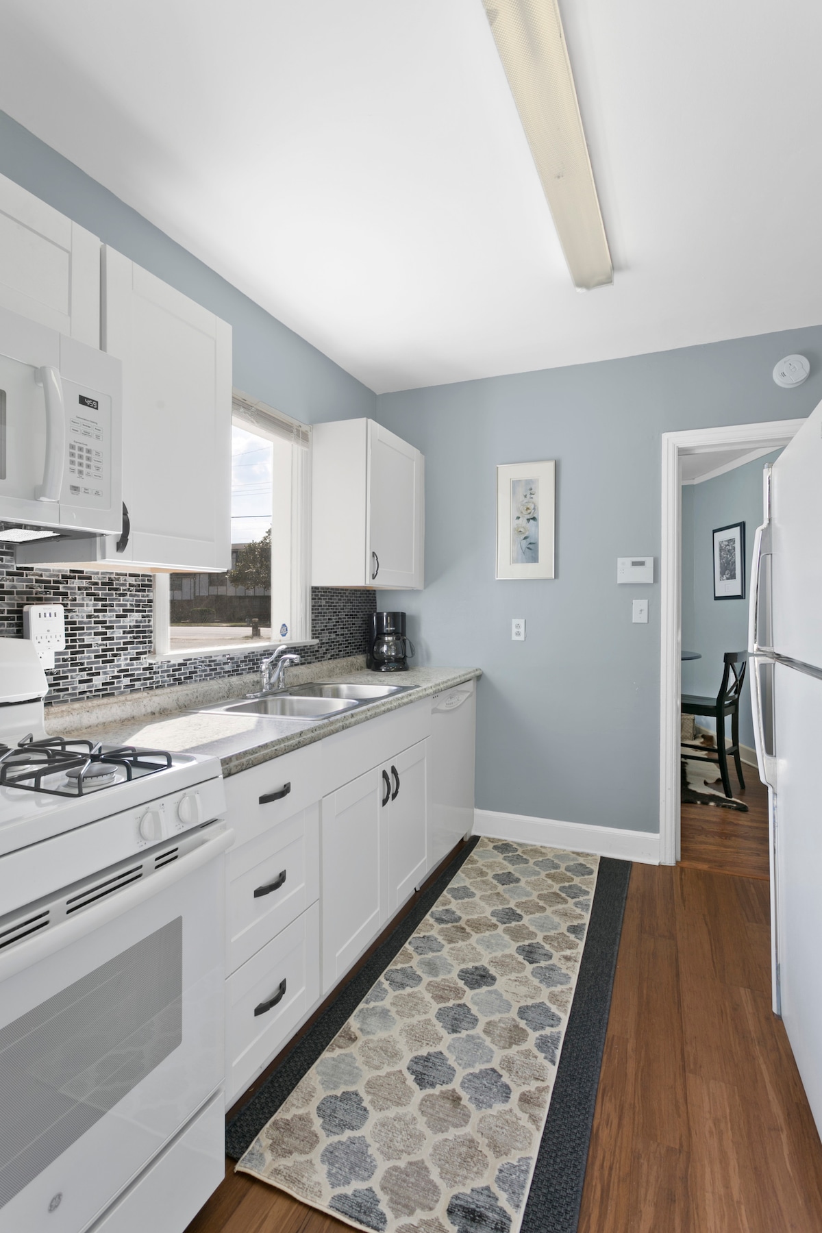 ¡Suite PRIVADA con jardín soleado! UNA cama tamaño queen: ropa de cama alta, sofá de dos plazas, baño completo con ducha (sin bañera), cocina americana con 2 quemadores eléctricos, nevera pequeña, microondas, tostadora, licuadora, gofres y cafetera. Wifi de alta velocidad. ¡Acabo de redecorar con pared de control de ruido, ropa de cama premium, Google Home y Netflix ya instalado! Nota: solo se asigna una plaza de estacionamiento.