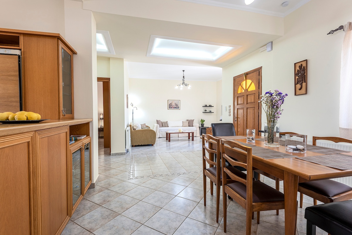 Experience the best of Kos island while staying at Omnia penthouse.A spacious,bright and stylish 145m2, 3bd apartment ,right on the top floor(2nd floor) of a 2 storey family building. Fully equipped kitchen,great balcony and air condition in every bedroom.Comfortably accomodating 6 people. Surrounded by supermarkets,restaurants,cofeeshops etc.Only 2 mins walk to the beach and 10 mins walk to the centre.Let it be your home away from home.