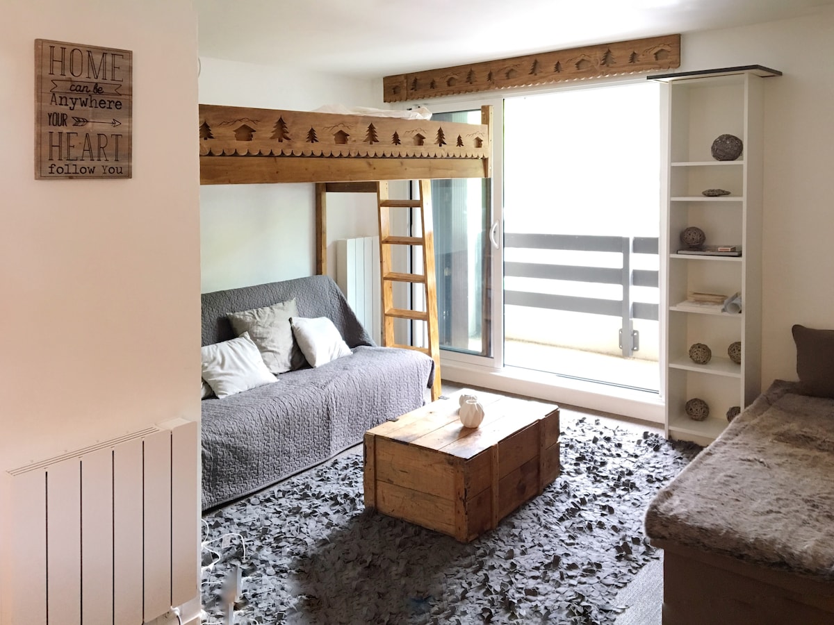 Encantadora cabaña T3 con una superficie de 40 m2 idealmente ubicada a 3 minutos a pie de la góndola de Skyvall y el lago y a 5 minutos a pie del corazón del pueblo y todas sus comodidades (restaurante, supermercado, prensa, Balnéa) Incluye una sala de estar con cocina equipada (lavavajillas, horno, microondas, nevera/congelador grande), sala de estar del comedor (TV, sofá convertible en una cama de 140 y mesa de comedor extensible). 2 habitaciones, incluidas 1 140 camas y 1 90 literas Balcón y estacionamiento