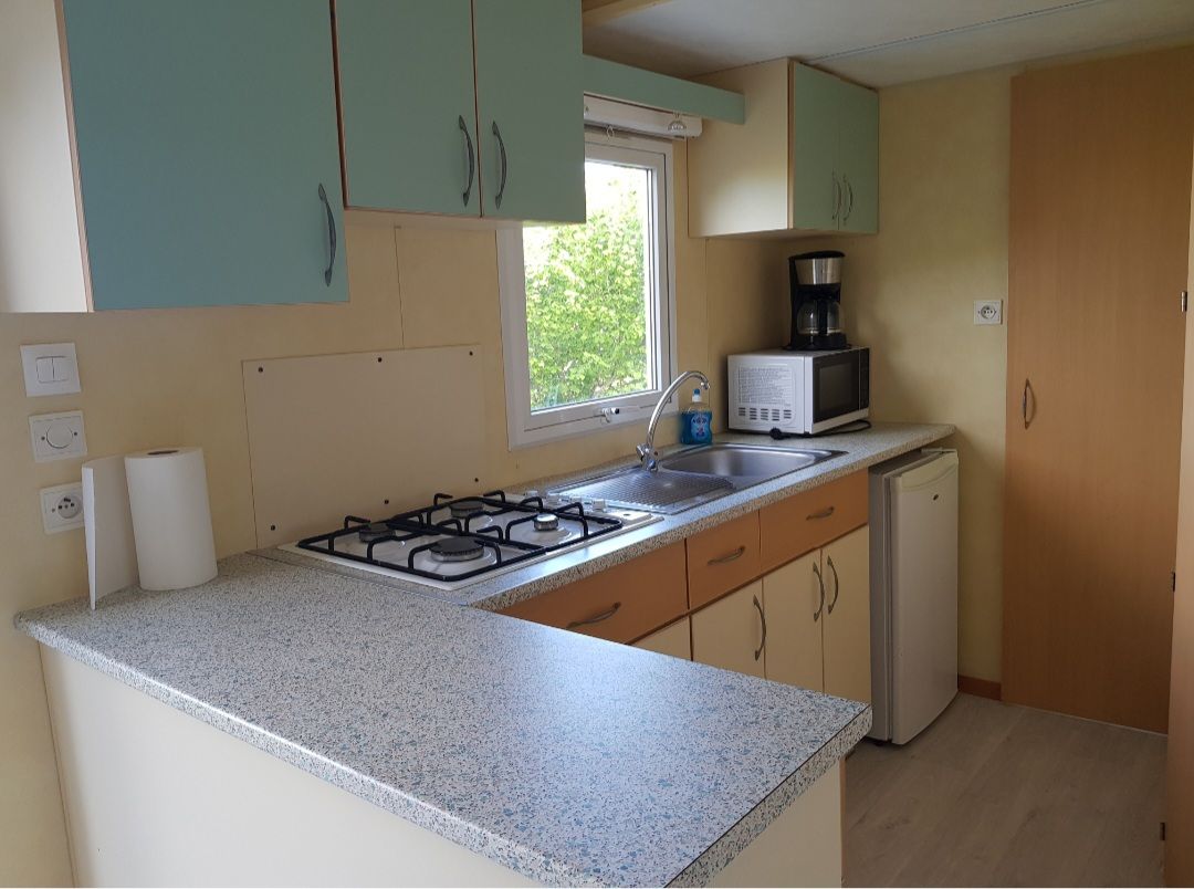 mobil home ubicado en una propiedad de 2000m2 arbolada y segura. Incluye 1 habitación doble y 1 habitación con 2 camas individuales, sala de estar con TV,1 cocina con microondas,cafetera,hervidor de agua,tostadora,lavadora. 1sala de ducha y WC separado. Tiene aire acondicionado. Desde la bonita terraza con flores o una sala de estar ,tenemos acceso a un jardín con mesa ,sillas y barbacoa. Proporcionamos ropa de cama y toallas. Un entorno tranquilo y florido a 2 km de una playa de arena .