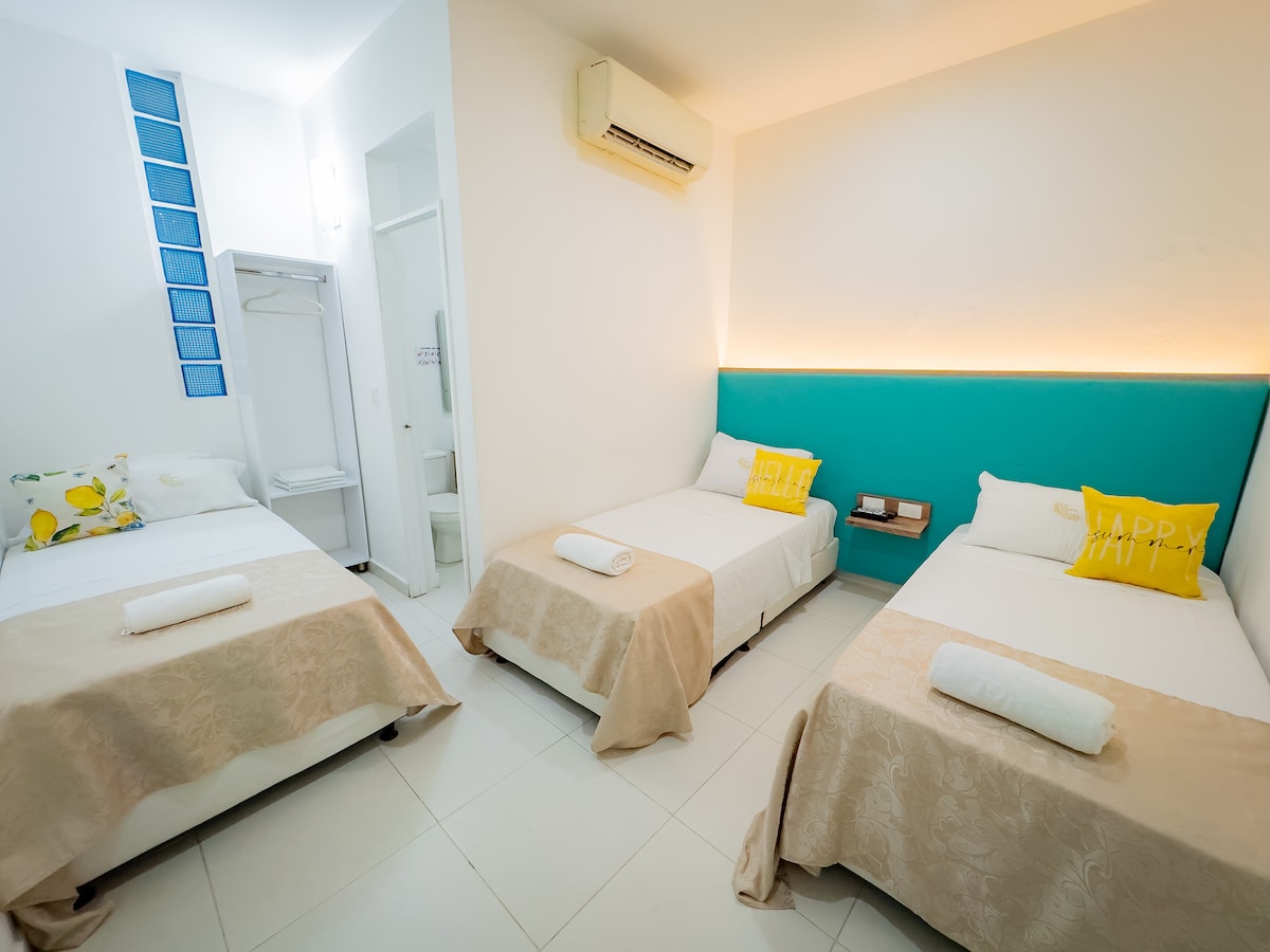 Habitación para 3 personas, un espacio único, cómodo y acogedor, cuenta con aire acondicionado, baño privado y Smart tv. el Hotel cuenta con servicio de parqueadero privado, nuestro bar tiene una terraza donde podrás degustar cocteles de primera, restaurante con una carta muy completa y que sin duda vas a deleitar el paladar con nuestras fusión de sabores, wifi en todas las Áreas y piscina y juegos de mesa. INCLUYE EL DESAYUNO TIPO AMERICANO