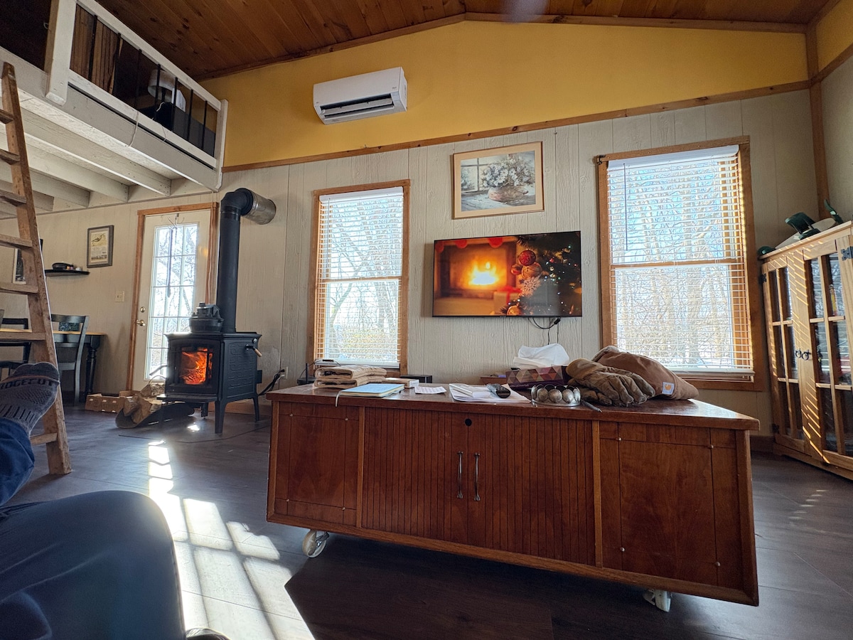 Quiet wooded setting for authentic log cabin: *Self-contained wooded area. Owners live nearby. Other homes visible in winter. *1/2 mile country dirt road passes homes on way to cabin. Please drive slowly! *Signs along road after GPS leaves off. *Parking area turn around. *Complete bathroom *Kitchen: convection oven/ air-fryer/ microwave combo, Keurig, toaster, under counter frig. / small freezer. *Loft queen bed *Double Futon *Pots, pans, utensils *Table service for 4 *Games, books