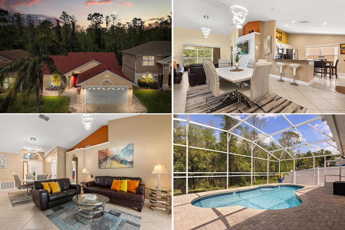 ¡Amplia casa de 4 dormitorios con piscina privada climatizada, a 15 minutos de Disney! Disfruta de una gran piscina orientada al sur, parrilla de propano, televisores inteligentes con Disney+ en todas las habitaciones. Nintendo Switch en el salón y una pantalla de85pulgadas con una PS5 en un garaje /sala de juegos con temperatura controlada. Wifi rápido, tejo, mesa de billar y muchos juegos de mesa. Diversión 🌴 al aire libre Asientos en el patio para 14 + dos tumbonas. Parrilla de propano: $50 por la duración de la estadía Calefacción de la piscina: $ 200 por estadía (aviso de 24 horas)